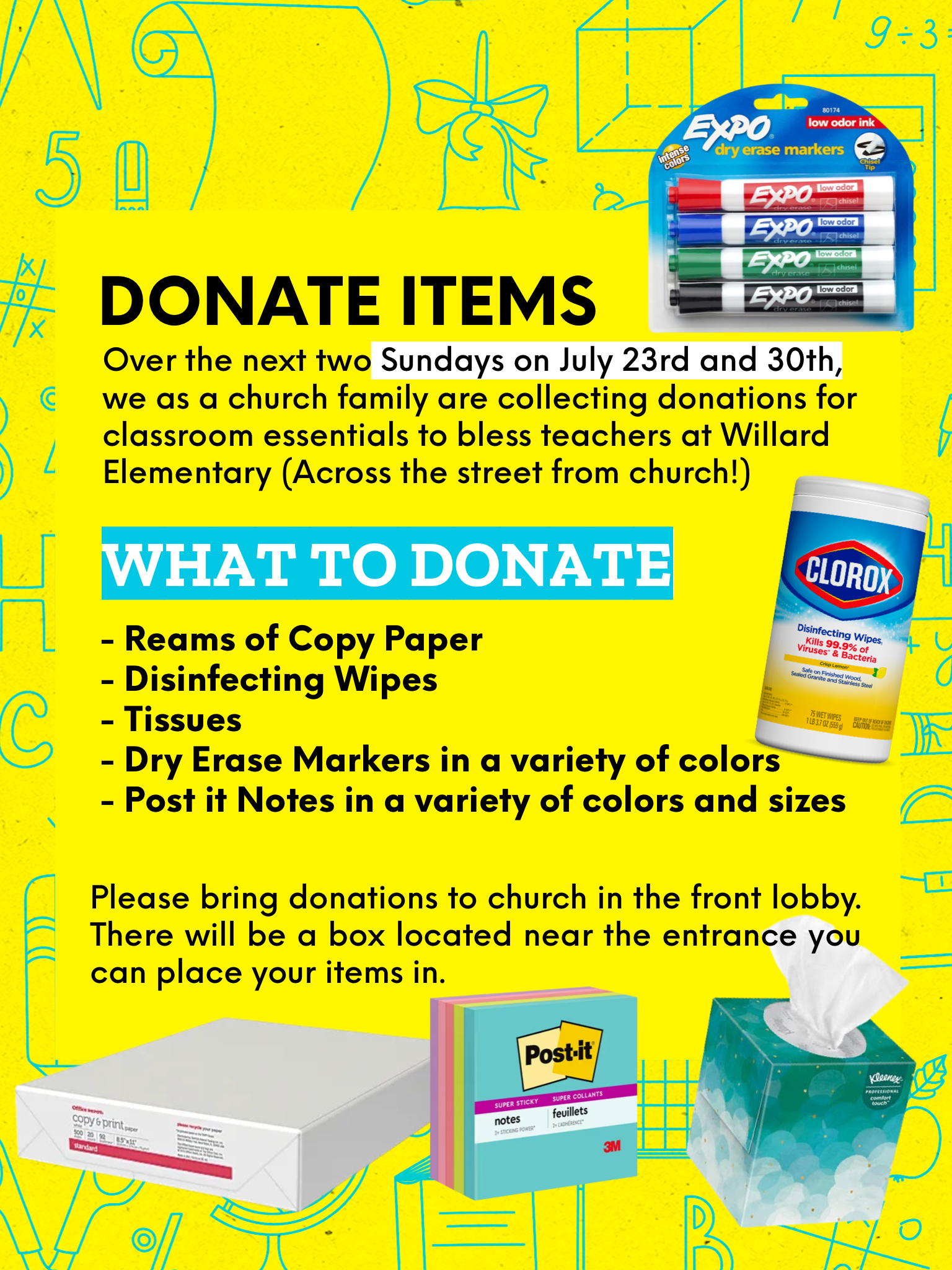 Over the next two weeks on Sunday July 23rd and 30th, we as a church family are collecting donations for classroom essentials for teachers!